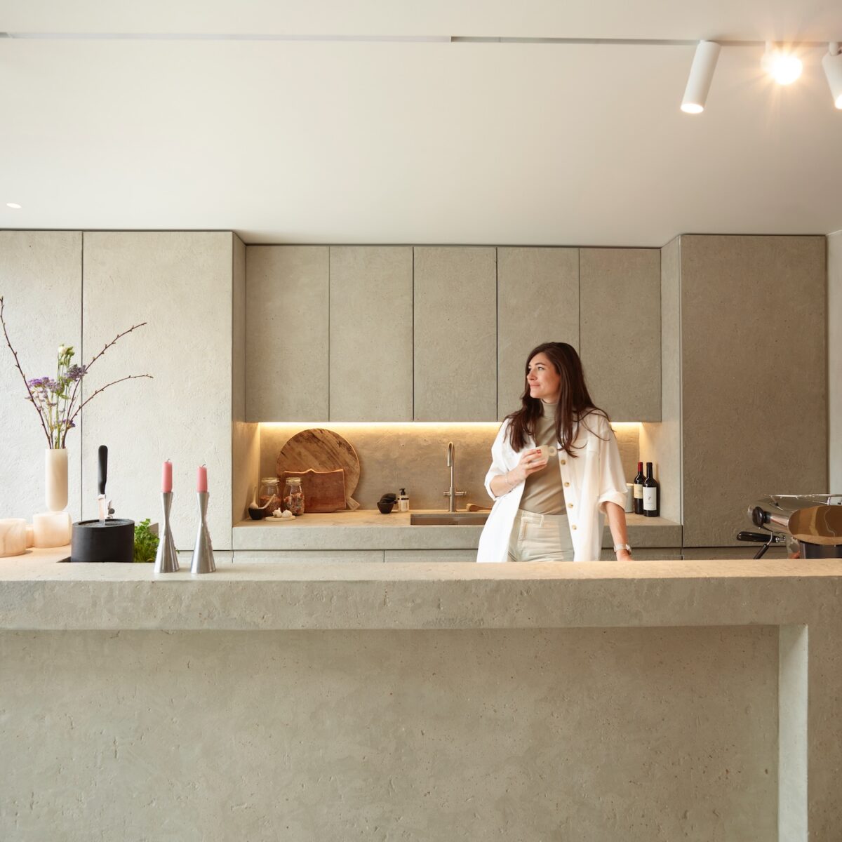 De rijwoning ligt middenin het gezellige, drukke Antwerpen-Berchem. De woning kreeg een grondige renovatie met aandacht voor de typerende architectuur uit 1954 die bewaard en nog versterkt werd. Zo komen de afgebogen muren doorheen de woning geregeld terug. Door binnenmuren te slopen, raampartijen te vergroten en een lichtstraat in het dak te voorzien, creëerde Anouk meer openheid en een overvloed aan daglicht dat de binnenruimte helder verlicht. “Maximaal wooncomfort met voldoende daglicht was de rode draad doorheen ons volledig renovatietraject”, vertelt Anouk.