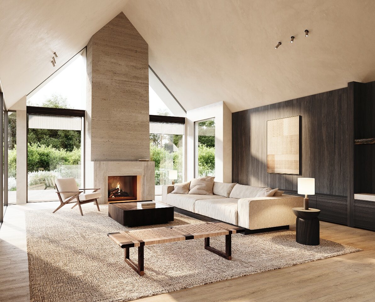 Dit project verenigt interieur en natuur op een subtiele en doordachte manier. Grote raampartijen laten het omliggende landschap deel uitmaken van het interieur en versterken een gevoel van openheid.